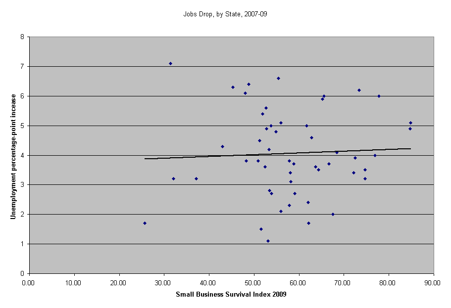 I thought I would plot the Jobs Crash numbers by state against some figures I have used before, the “Small Business Survival Index 2009.” It ranks the states by their tax rates, regulatory climate and general attitude toward business. Here’s the chart I came up with: