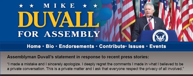 Former Assemblyman Michael D. Duvall of Yorba Linda, who left office suddenly in September 2009 following revelations that he talked freely of alleged sexual conquests in a legislative hearing chamber, has given away just about all of his old campaign cash. According to a May 26, 2010 filing with the California Secretary of State’s office, between Jan. 1 and May 22 of this year the Farmers Insurance agent spent $64,928.16 of his $67,718.44, leaving just $7,179.49 left in his campaign account.