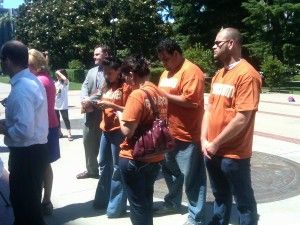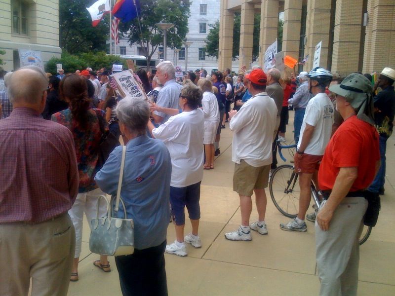 The contrast between the rally crowds was noticeable as well: the crowd was mostly bused in to the Capitol rally, and had boxed lunches waiting, while the city hall rally attracted young families, retired couples and workers on lunch breaks. No lunch was served.
