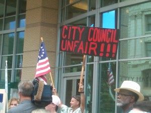 At the city hall rally, local radio talk show host Eric Hogue (AM 1380) whipped up the crowd and talked about city council being “a fine example of local government out of control”… and how they will eventually end up in elected positions at the capitol doing the same thing. “We the people…” was the crowd’s response.