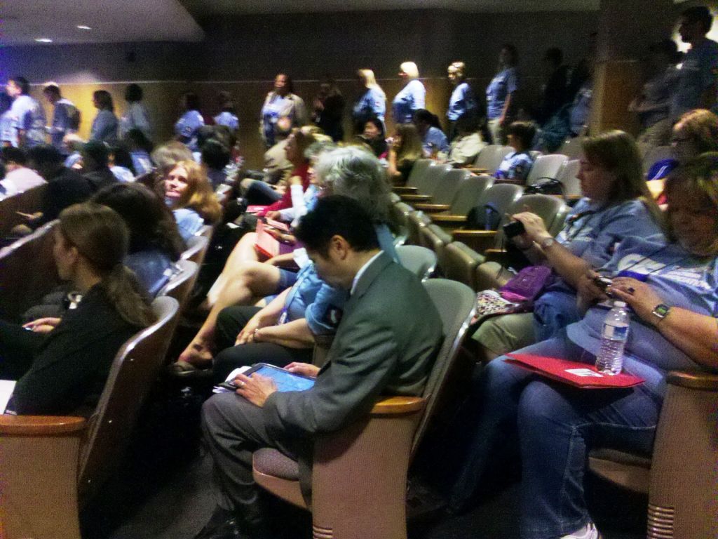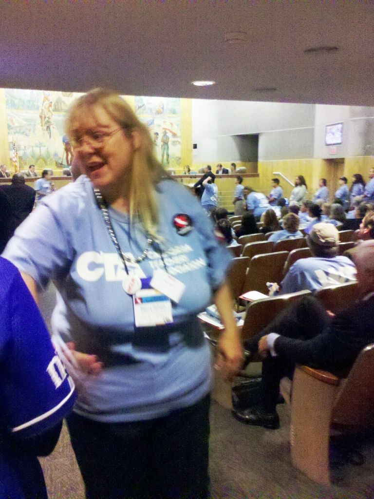 The large Capitol hearing room was filled with teachers, unions representatives and activists opposed to Dutton’s bill, who cheered and jeered throughout the hearing. I’ve include a couple of pictures I took at the hearing.