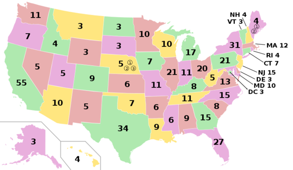 Under the U.S. Constitution, “electors” are chosen from each state according to the sum of its members of the U.S. House of Representatives and two senators. Thus, California currently has 55 electoral votes, while small Wyoming has three.
