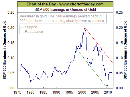 Now, we can see how the economy really has done by looking at how well the Standard & Poors 500 Earnings index has done compared to gold. Earnings are crucial because they provide the funds for future investment and growth. No earnings, no growth.