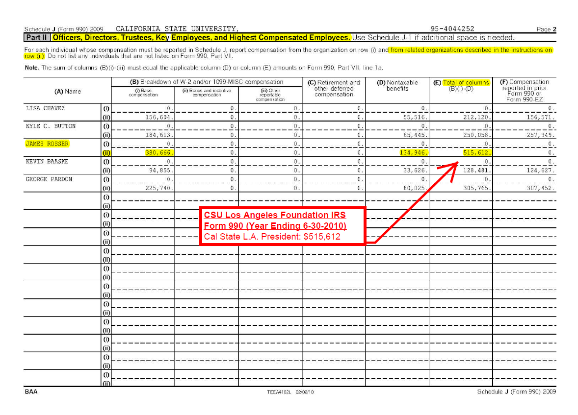 California State University officials have provided false and misleading information to the public about the total compensation provided to at least one of the system’s 23 presidents, a CalWatchDog.com investigation has found. According to IRS documents of the Cal State University Los Angeles Foundation, CSULA President James Rosser reported receiving $515,612 in total compensation for fiscal year 2009-10, which ended on June 30, 2010. The half-million dollar figure is roughly $200,000 more than CSU’s previously cited base salary of $325,000 per year. (For this and other numbers, please see the 15 pages of confirming documents below.)