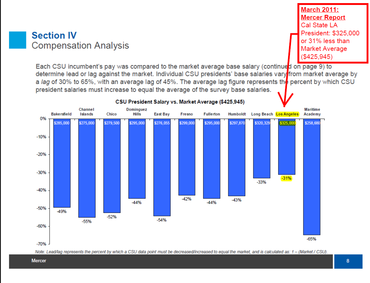 Cal State’s campaign to mislead the public about the total compensation package provided to its top executives dates back to last March, when the system hired the high-priced Mercer consulting firm to conduct a competitive pay analysis. The Mercer Report, which has been criticized by California Watch for using bogus comparator institutions, included two references to Rosser’s compensation of $325,000. Under Section IV, “Compensation Analysis,” Mercer concluded that Rosser’s salary was 31 percent lower than the “market average” of $425,945 per year. CalWatchDog.coms revelation of Rosser’s total compensation of $515,612 per year would dramatically alter this comparison. Instead of trailing the “market average” by 31 percent, Rosser would exceed it by 21 percent.