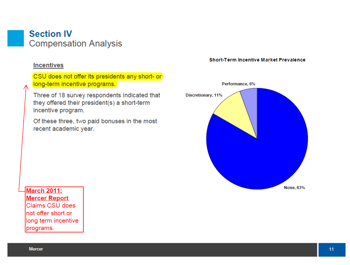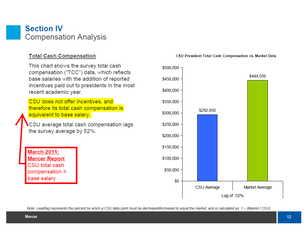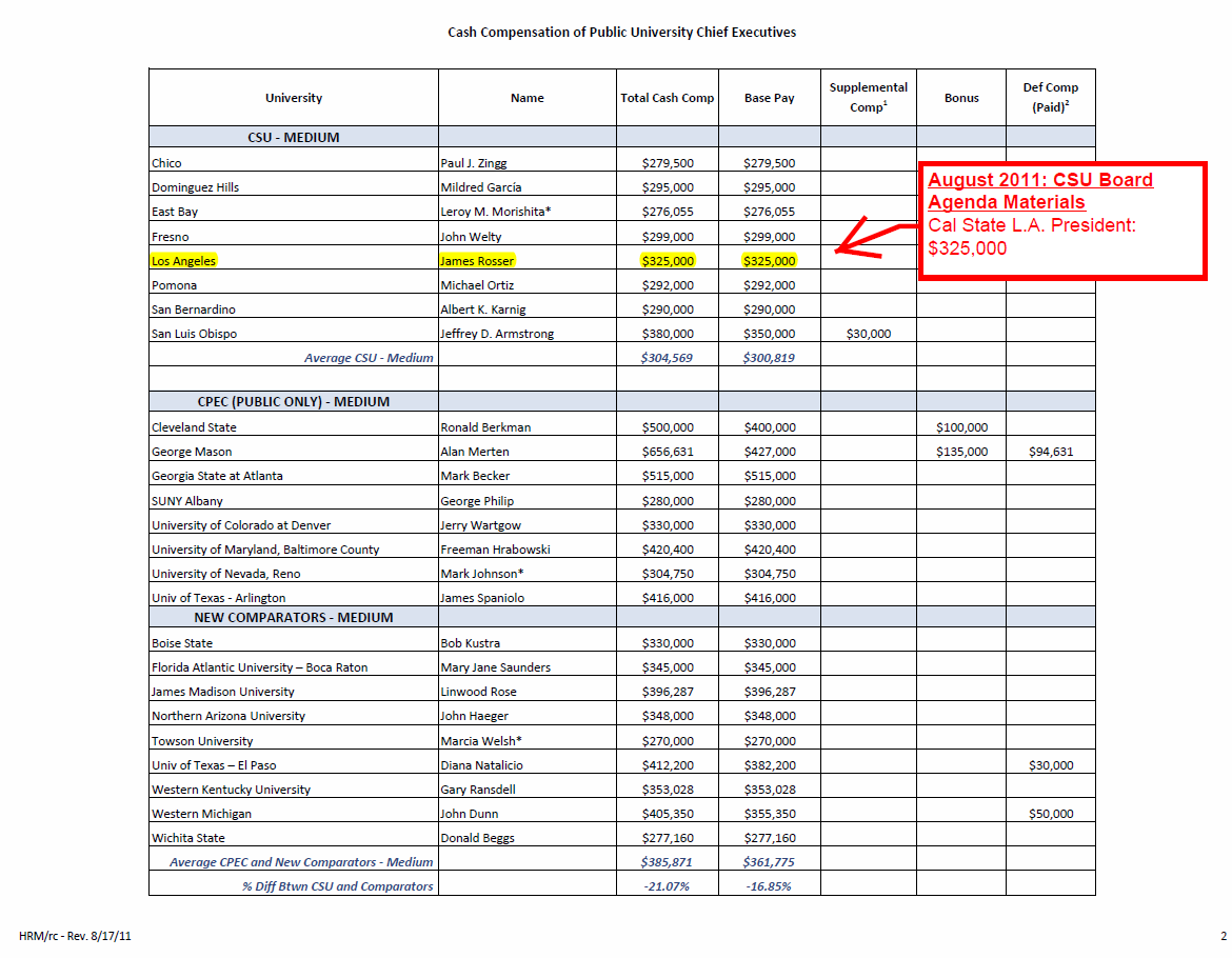 In advance of an August 2011 meeting of the Board of Trustees, CSU staff prepared a 15-page report titled, “Cash Compensation of Public University Chief Executives.” The document summarized the Mercer Report and other executive compensation data. In that report, Rosser’s total compensation is listed at $325,000, with empty boxes in a table that included options for supplemental compensation, bonuses and deferred compensation.