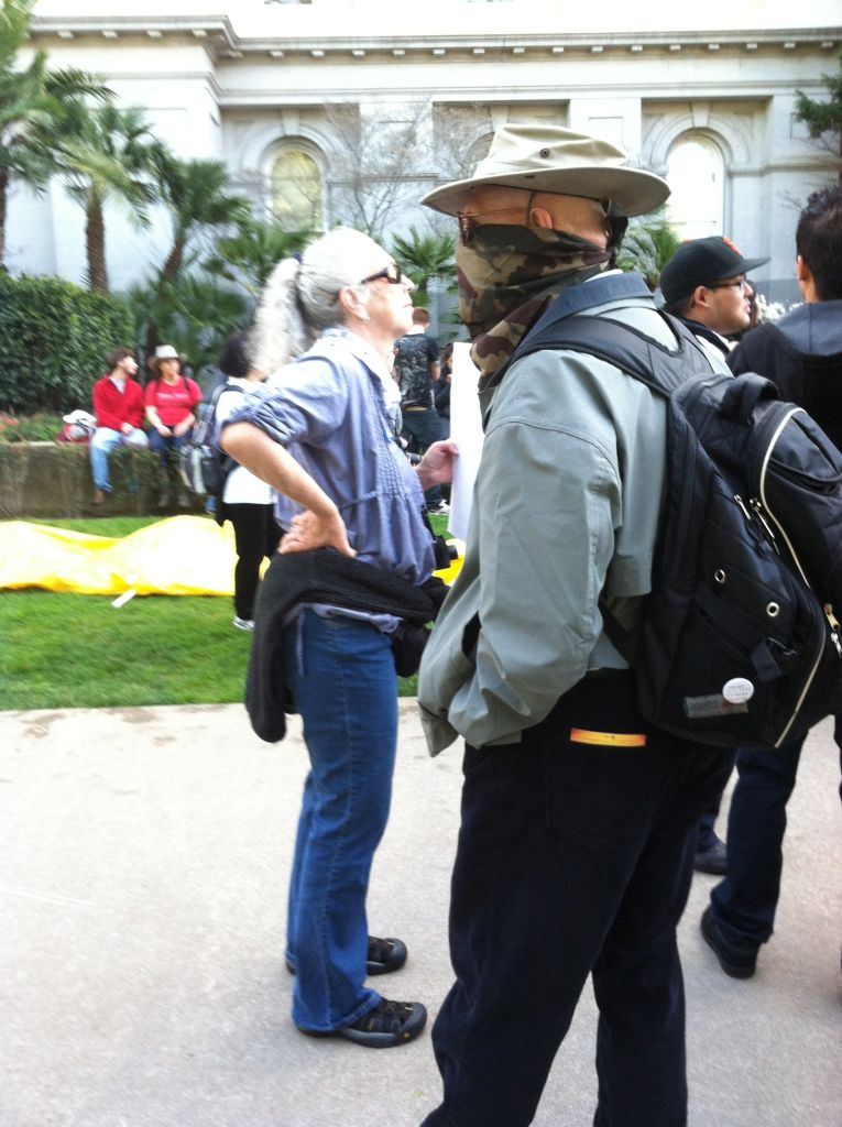 Bullhorn fellow tried to gin up his group by bringing up the Occupy Oakland protests. Instead of engaging, some of his group walked away. “Five hundred years of oppression, and look where it’s got us,” said a black protestor who had been hanging out with bullhorn guy’s group.