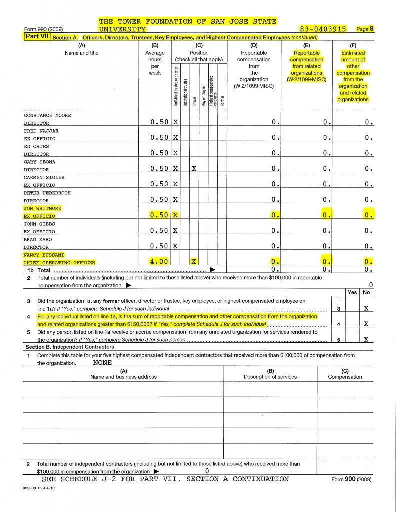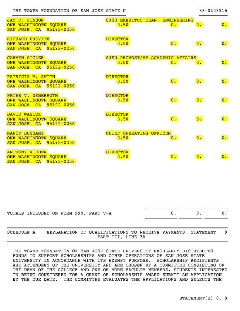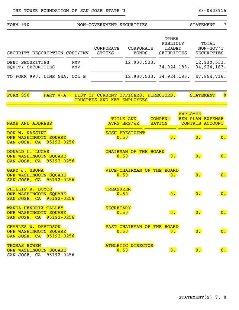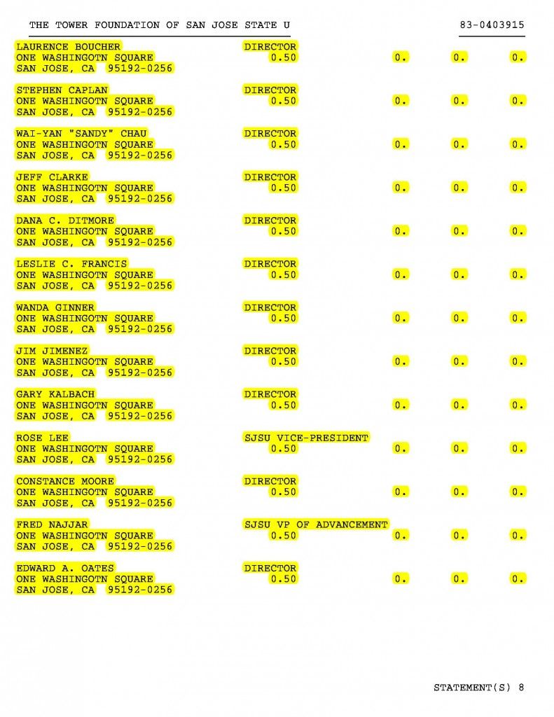 In 2007, at least seven college employees are listed as board members, trustees, directors or key employees of the foundation: Fred Najjar, SJSU vice president of advancement; Rose Lee, SJSU vice-president; Thomas Bowen, athletic director; Don Kassing, SJSU president; Jay Pinson, SJSU emeritus dean of engineering; Sigler, SJSU provost and vice president of academic affairs; and Nancy Bussani, Tower Foundation CEO. All are listed with zero compensation from the organization or related organizations.