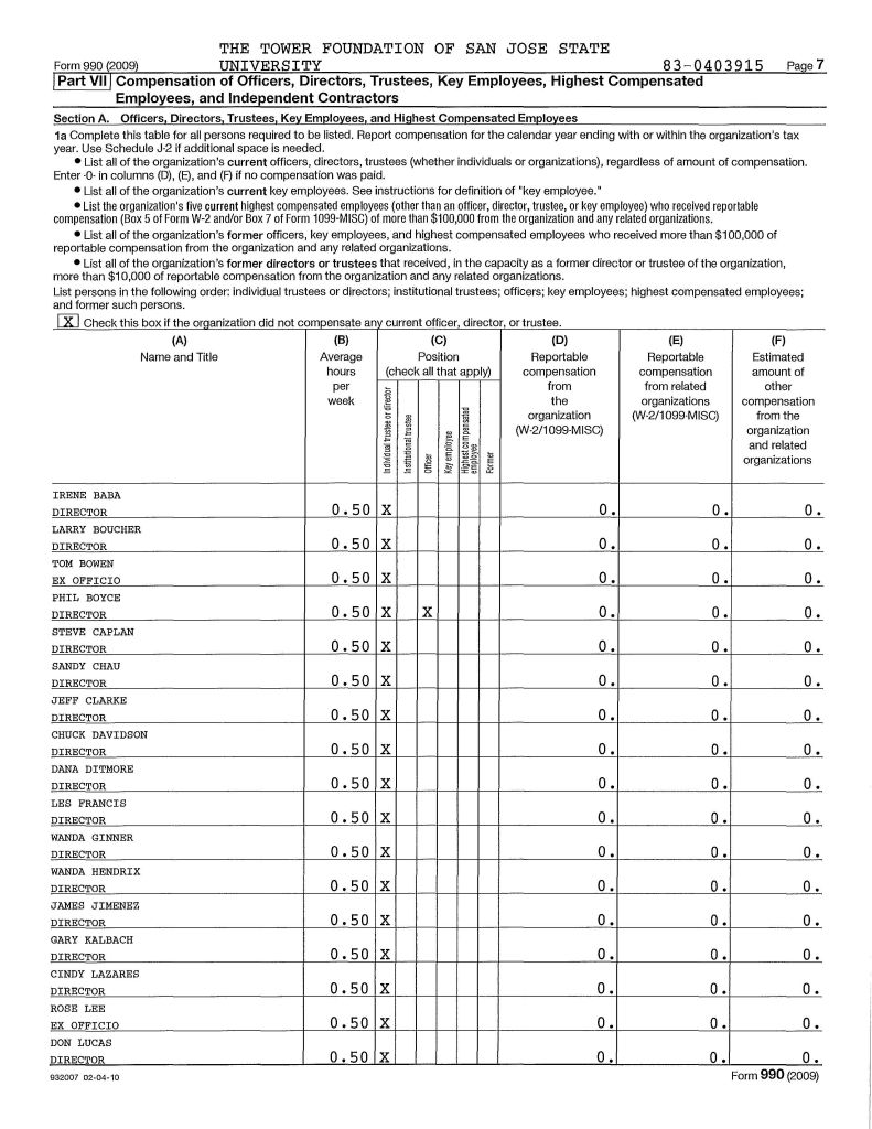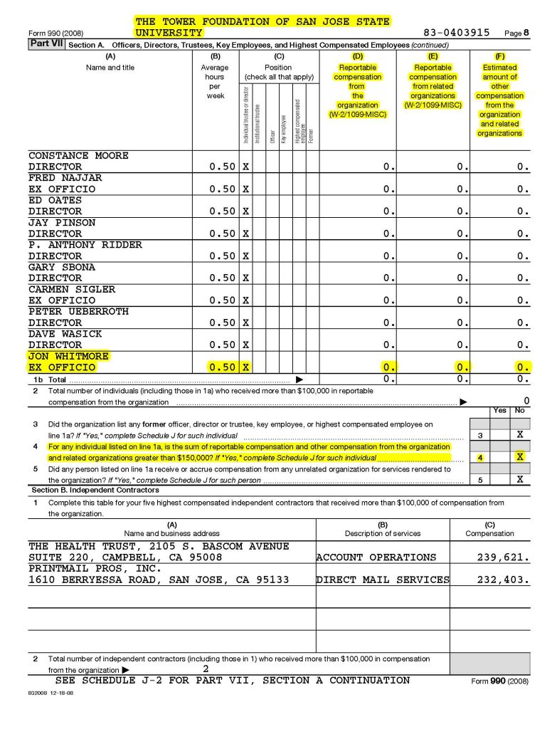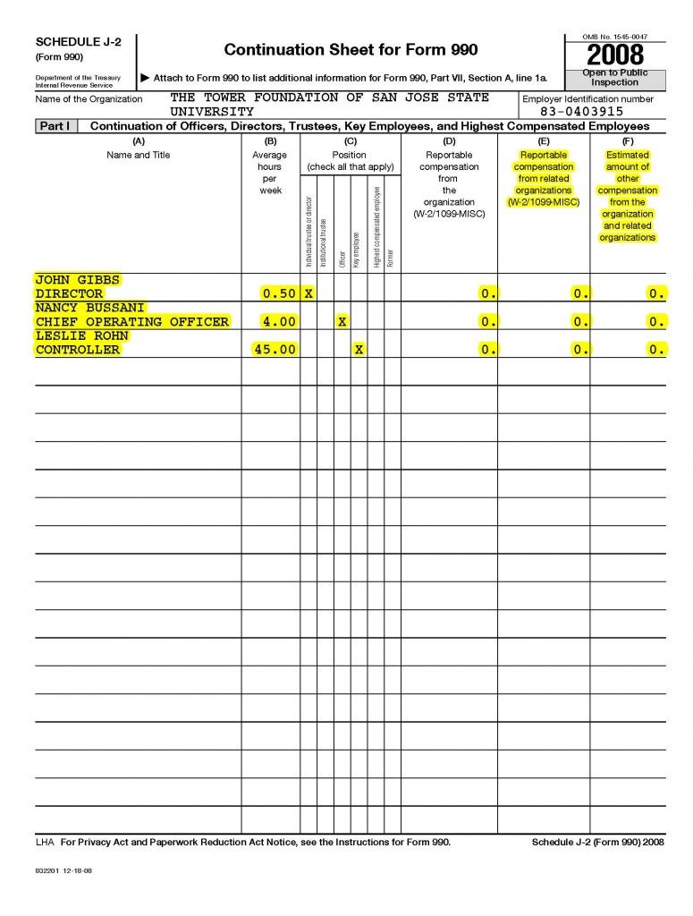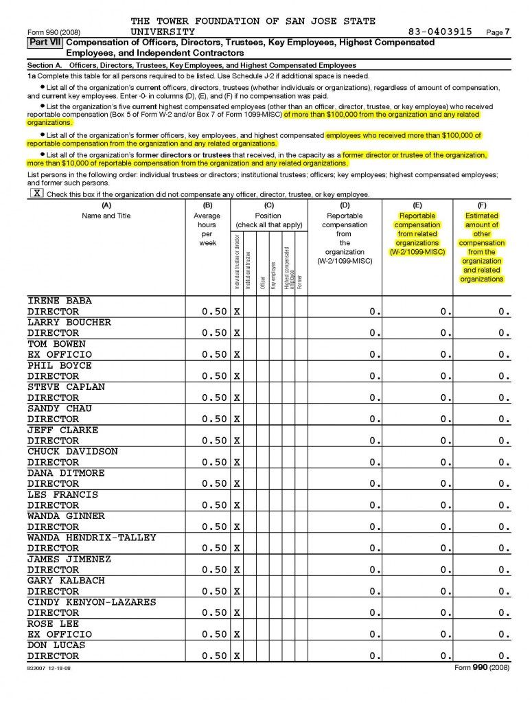 In 2007, at least seven college employees are listed as board members, trustees, directors or key employees of the foundation: Fred Najjar, SJSU vice president of advancement; Rose Lee, SJSU vice-president; Thomas Bowen, athletic director; Don Kassing, SJSU president; Jay Pinson, SJSU emeritus dean of engineering; Sigler, SJSU provost and vice president of academic affairs; and Nancy Bussani, Tower Foundation CEO. All are listed with zero compensation from the organization or related organizations.