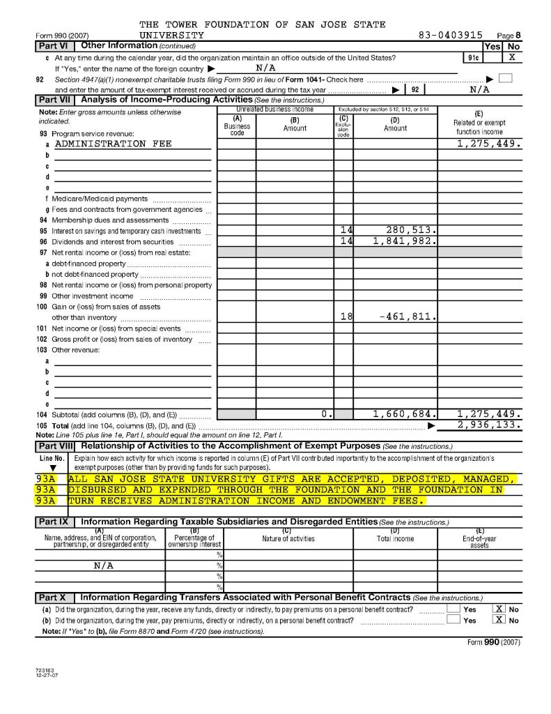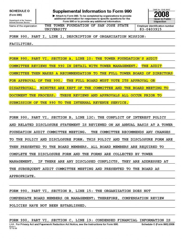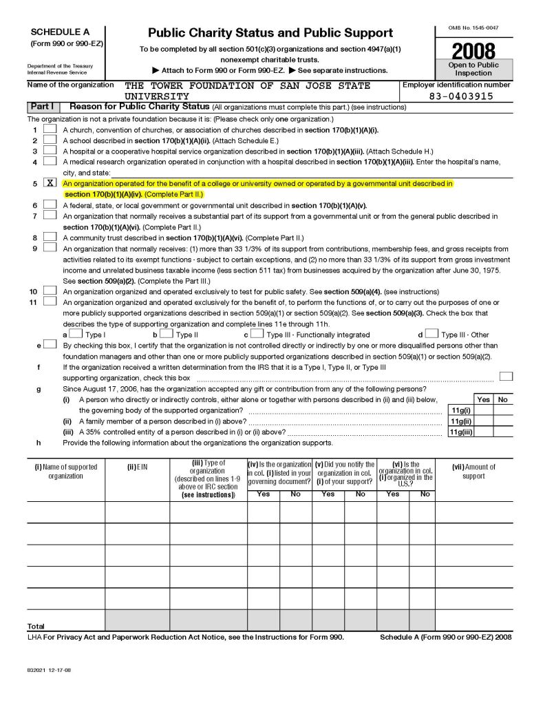 It would appear self-evident that the Tower Foundation of San Jose State University is related to the university. Should there be any dispute of the foundation’s awareness of the relatedness, on Page 2 of Form 990 the group stated: “The Tower Foundation of San Jose State University is organized exclusively for educational purposes of promoting and advancing the objectives of San Jose State University.”