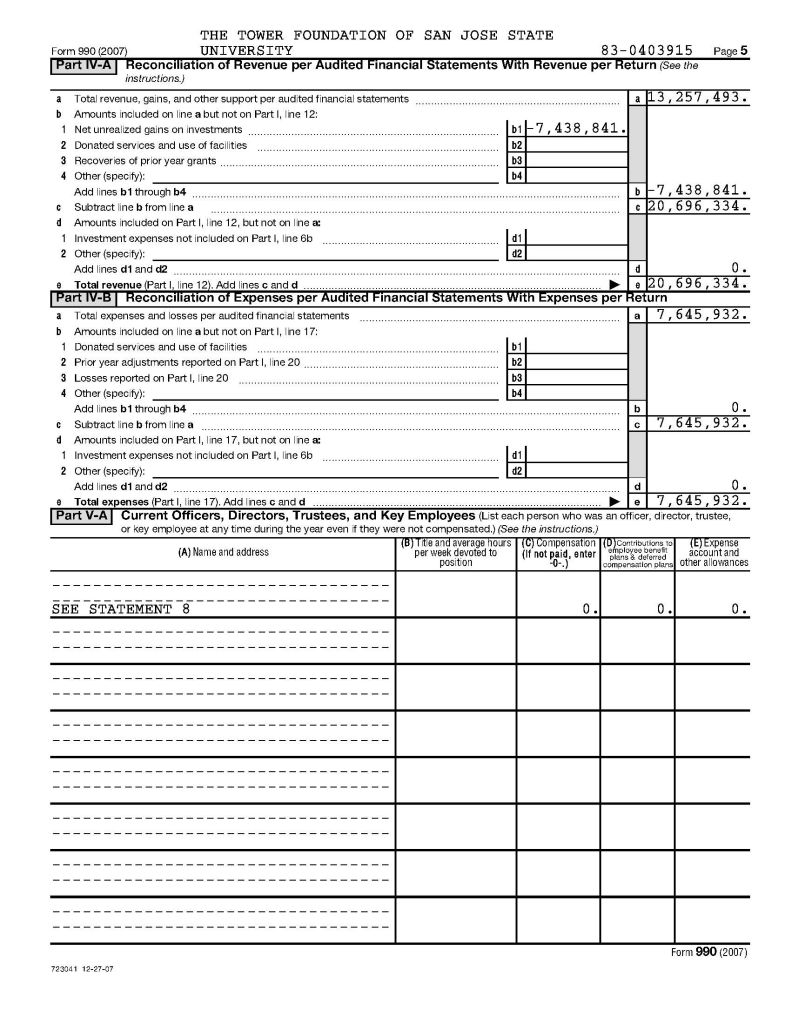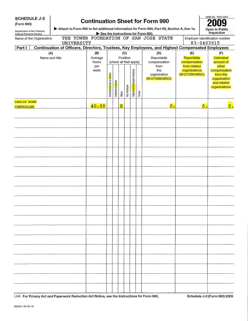 The Tower Foundation of San Jose State University on federal tax returns for 2007, 2008 and 2009 reported zero compensation paid by the organization or any related organizations to more than a half dozen high-ranking university personnel, including the college’s president, provost, athletic director and several vice-presidents.
