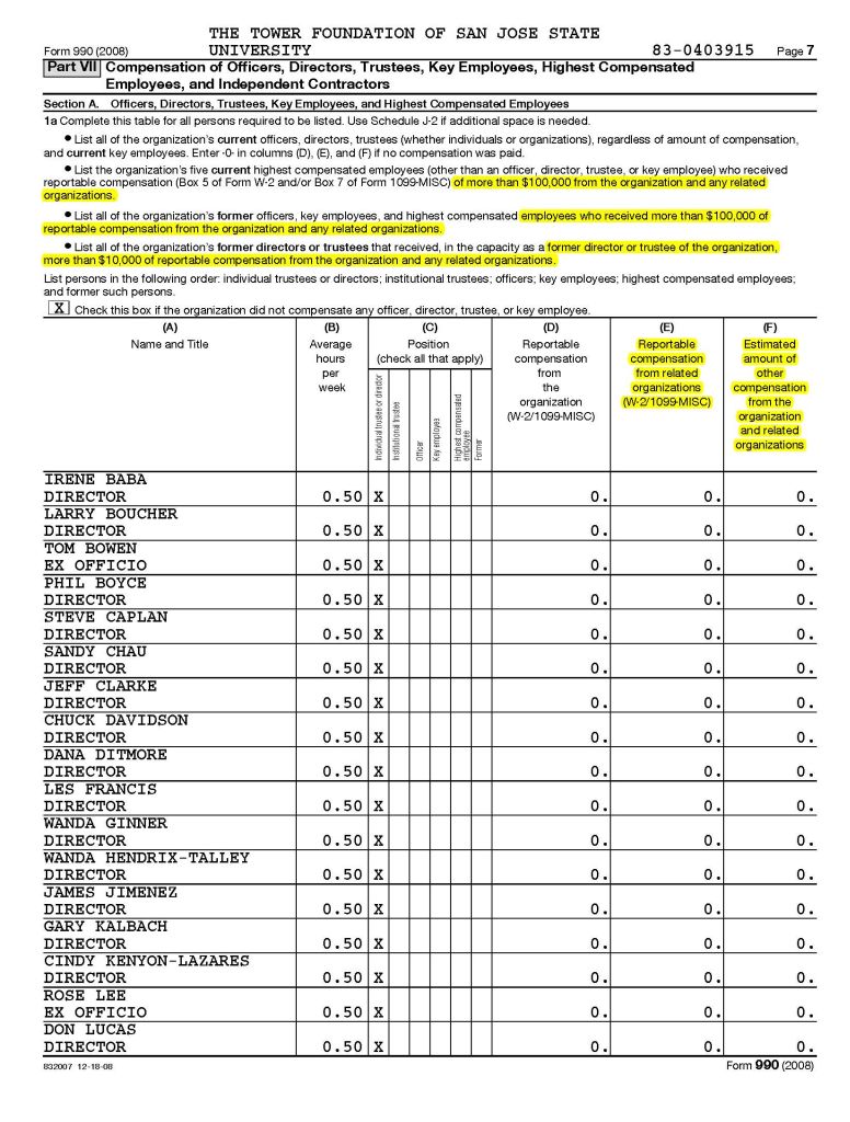 In 2008, the Tower Foundation again listed zero compensation for all members of the board. Under Part VII Compensation of Officers, Directors, Trustees, Key Employees, Highest Compensated Employees, and Independent Contractors, the organization was warned with three separate instructions of the requirement to disclose compensation from the organization and all related organizations: