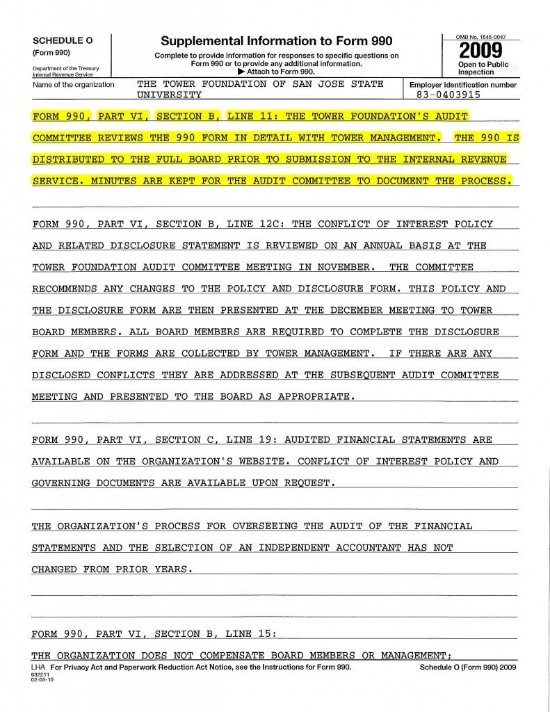 “Form 990, Part VI, Section B, Line 11: The Tower Foundation’s audit committee reviews the 990 form in detail with tower management. The 990 is distributed to the full board prior to submission to the Internal Revenue Service. Minutes are kept for the audit committee to document the process.”