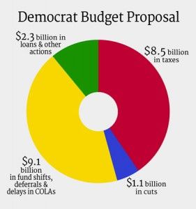“As the budget moved through the process, Democrats argued that their majority vote budget is balanced with $8.6 billioni in tax increases and $8 billion in cuts,” California Budget Fact Check wrote today.