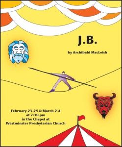 In Archibald MacLeish’s 1958 play, “J.B.,” the devil disguised as a popcorn vendor destroys the property and children of a wealthy banker named “J.B.” to test his faithfulness to God. God, portrayed as a balloon vendor in a circus, offers to restore J.B.’s life if he returns to the religion he rejected. J.B. selects a different path and is content with his choice. “J.B.” is a modern version of the Biblical story of Job: hence the title “J.B.”