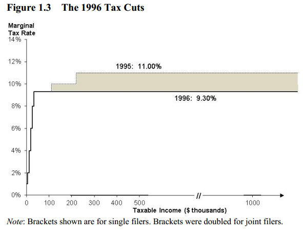 The other tax change looked at was the 1996 tax reduction, when Gov. Pete Wilson’s 1991 tax increase, which boosted the top tax rate from 9.3 percent to 11 percent, fell off the books.