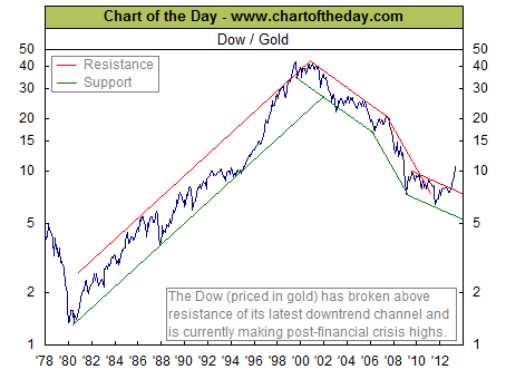 What if America had stayed on the gold standard? How would stocks have performed? The following chart shows the Dow Jones Industrial Average pegged against gold.